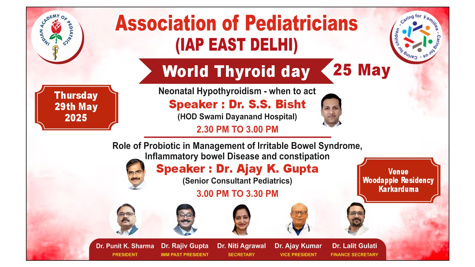 We are pleased to invite you for an interactive session with Dr SS Bisht, Topic : Neonatal Hypothyroidism- When to Act & Dr Ajay Kumar Gupta, Topic: Role of Probiotic in Management of Irritable Bowel Syndrome,Inflammatory bowel Disease and constipation on 29th May 2025 at Woodapple Residency Karkarduma.